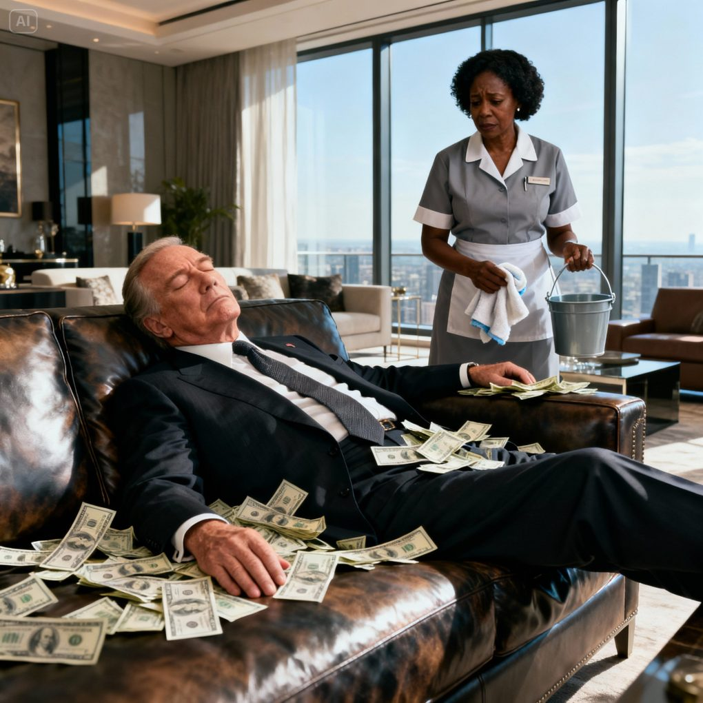 When Martha entered the room, she froze. The sight was bizarre — her wealthy boss asleep on a mountain of money, bills scattered around like fallen leaves. She glanced toward him, her face unreadable. Edward, keeping one eye almost closed, watched. She sighed softly, then began to tidy around the room — but not once did she touch the money. Edward’s smirk widened. Maybe she’s too clever, he thought. She’ll wait until she’s sure I’m asleep.
