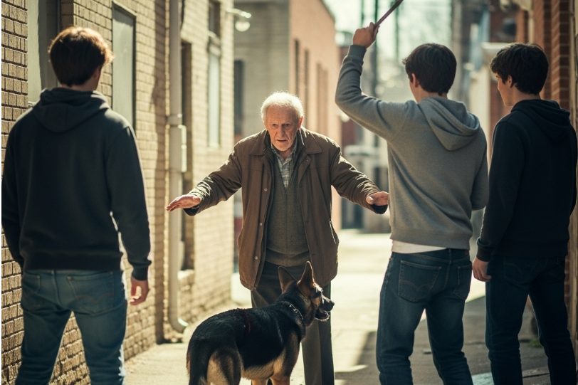 Three teenage boys had cornered a stray — a young shepherd mix with matted fur and frightened eyes. The smallest one held a metal rod. The others egged him on.